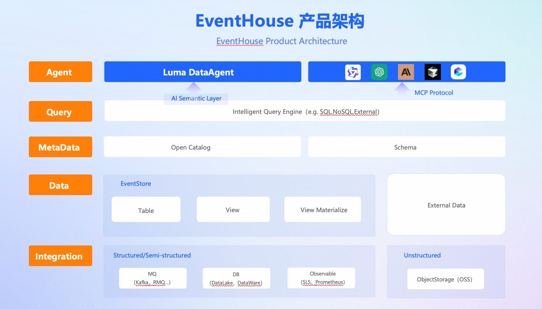 EventHouse 的核心架构采用分层解耦的设计,清晰地划分为集成层、数据层、元数据层、数据查询与数据智能层。每一层都由特定的核心组件支撑,共同构成了一个强大的数据处理与分析闭环。同时每个层级都相对独立,可拆分使用或者一站式端到端使用。