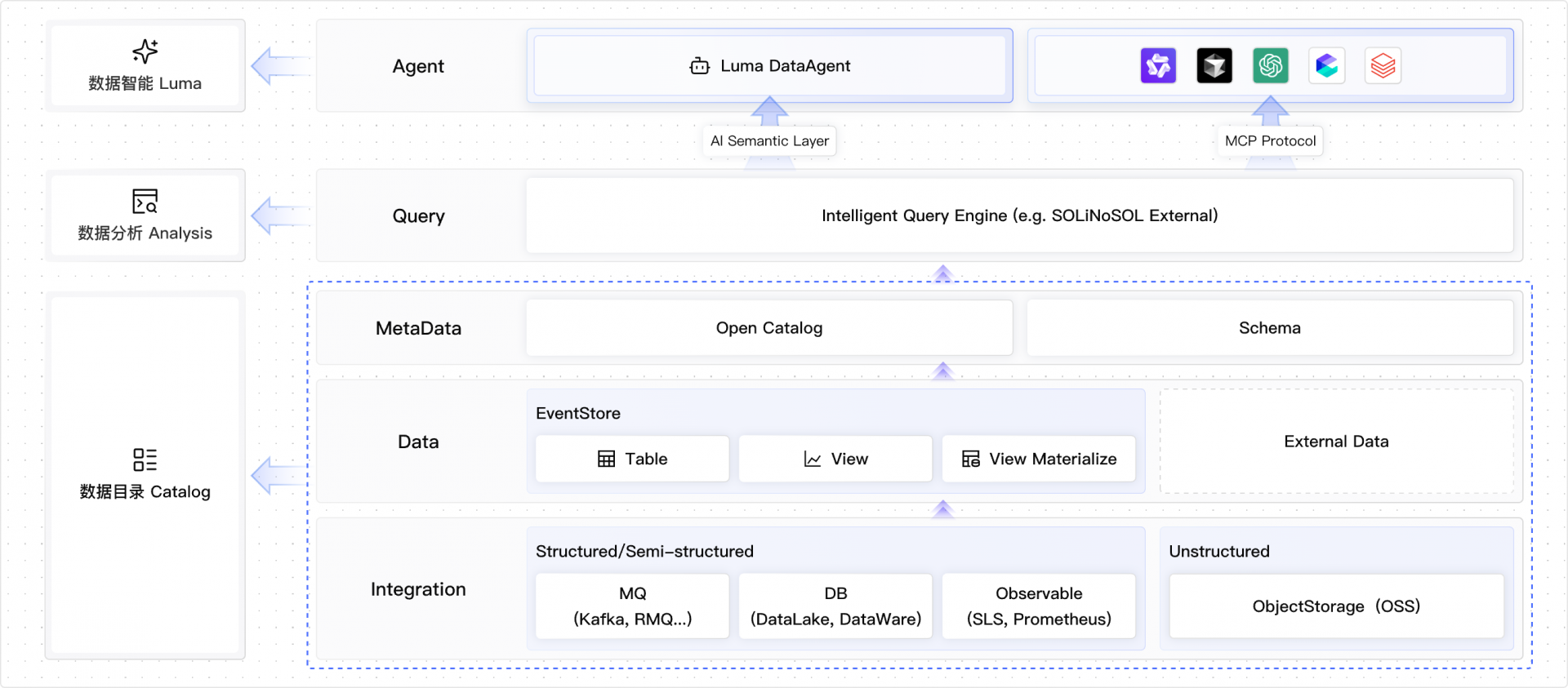 我们借助这套架构完整闭环了 企业数据 > Agent 的 Bridge ;值得强调的是 EventHouse 并非一个孤立的存储或者检索引擎,而是一个由多个解耦层组成的完整 DataAgent 体系,在架构中每个层级都可以单独拆分使用,旨在构建一个真正面向未来的数据平台。