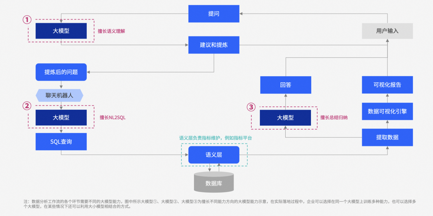 ChatBI 主要解决的问题就是如何生成 SQL 来读取数据,其核心是将用户的自然语言查询转换为可执行的 SQL 语句(即 NL2SQL),从而实现数据分析于数据查询。值得注意的是 ChatBI 返回的 SQL 生成的可视化报告不会经过大模型处理,将直接反馈给客户。